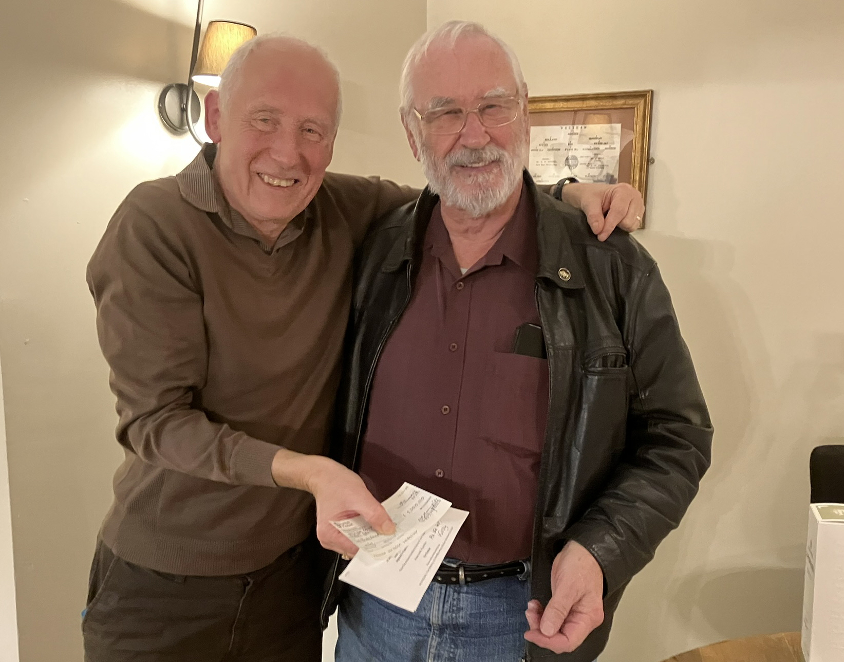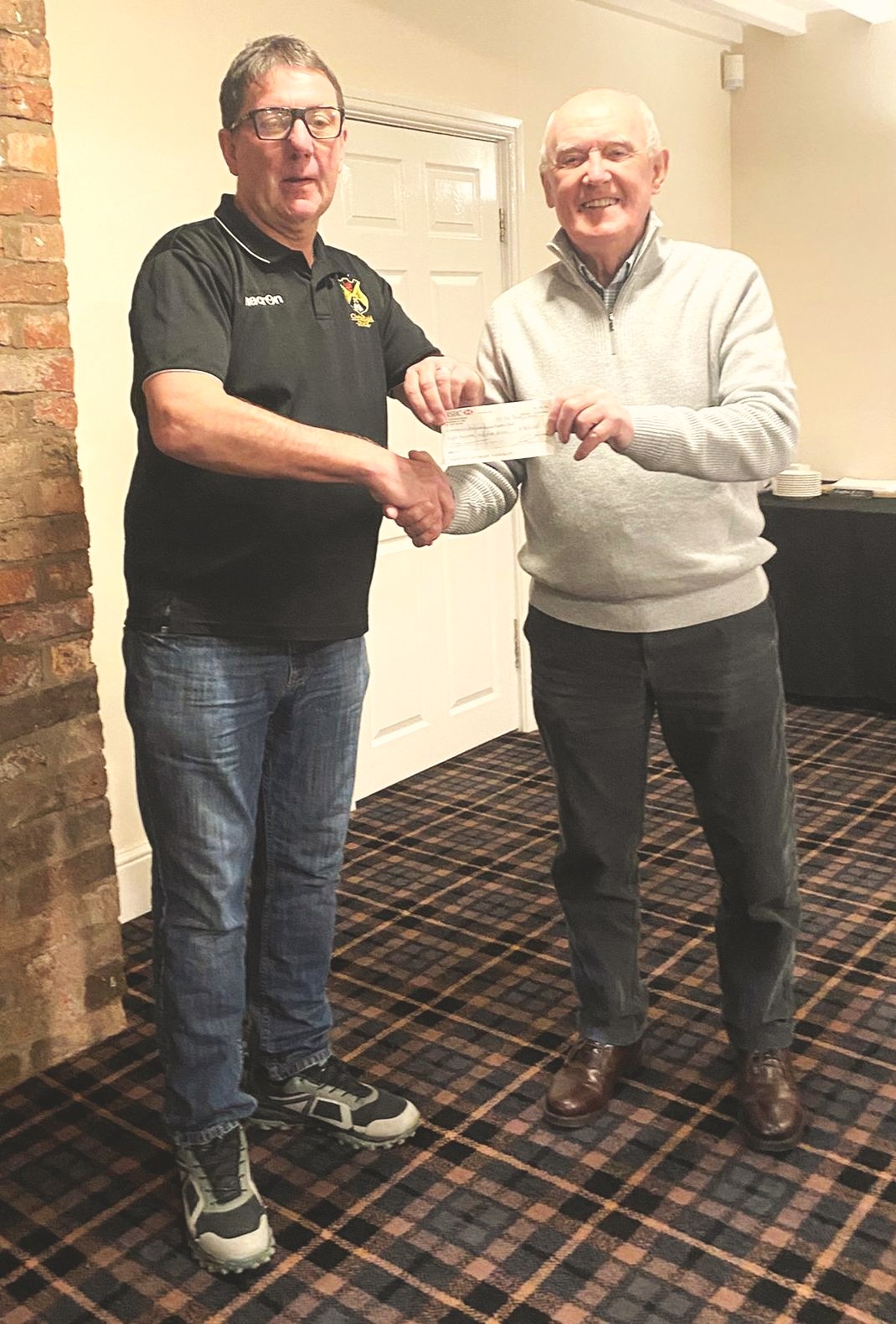 Ted Capstick on the left presenting the cheque to Treasurer Frank Maddocks